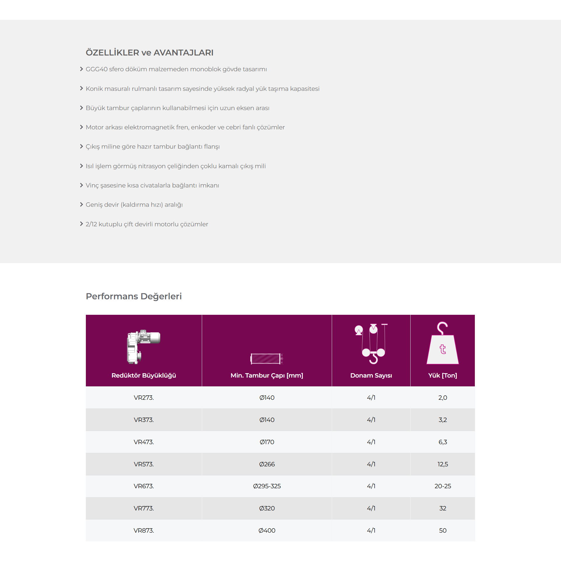 Vinç kaldırma uygulamaları için özel tasarlanmış eksen arası uzun giriş ve çıkış milleri birbirlerine paralel olan, DIN 5480 standartına göre çoklu kamalı çıkış miline sahip helisel dişli redüktörlerdir.